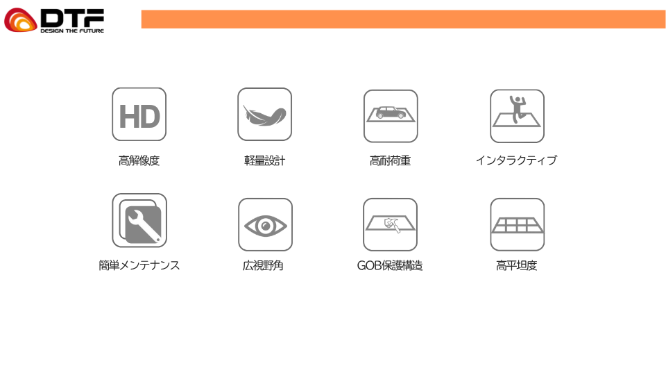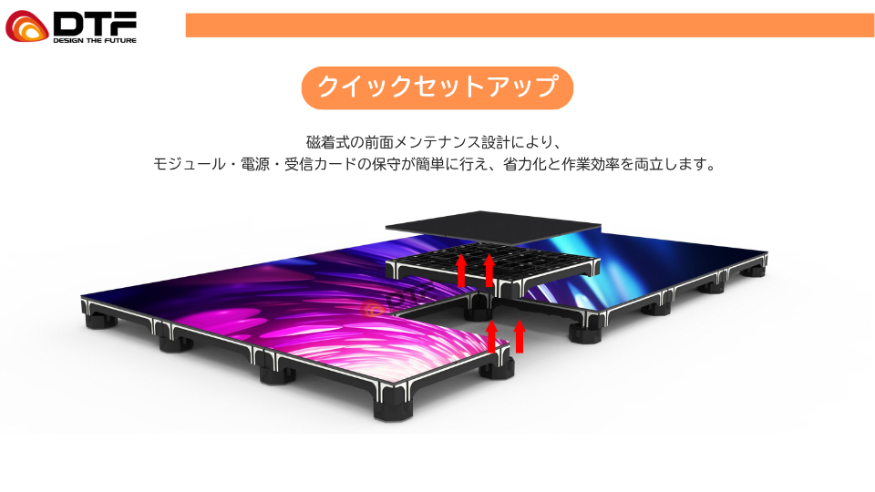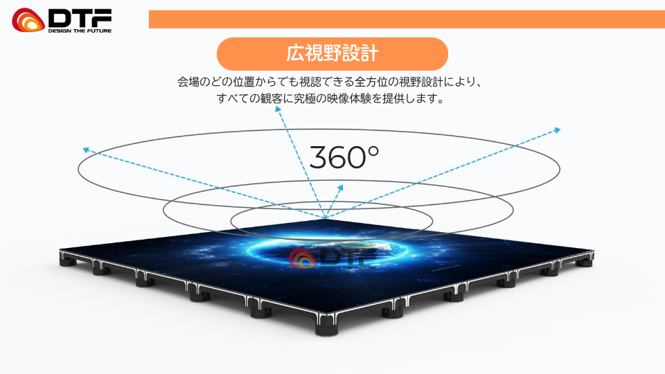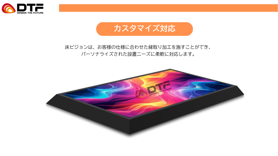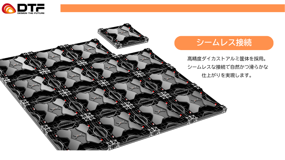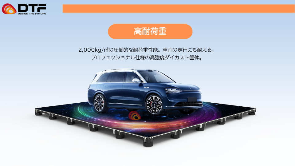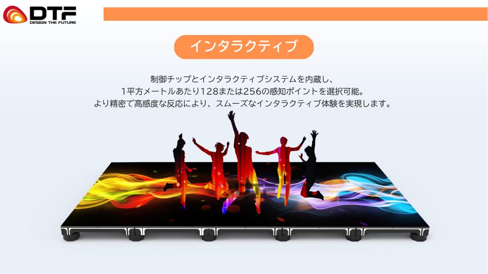 最新のGOB技術を採用することで、従来のフロアLEDに見られた色味の劣化を解消し、壁面LEDと遜色ない鮮明なカラー表現を実現。耐摩耗性・滑り止め・防水性・鈍化防止機能を備え、最大2トン/㎡の荷重にも耐える高耐久設計です。スリムで軽量な構造により施工も容易で、センサーチップや赤外線レーダーを活用したインタラクティブ機能の搭載も可能です。