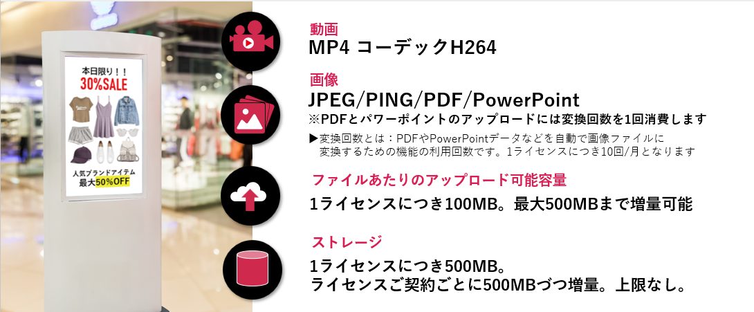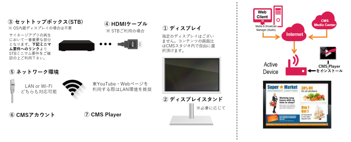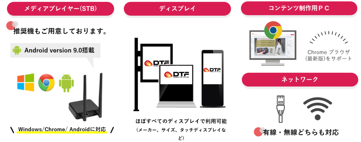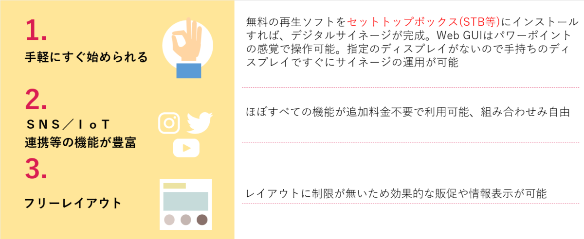 無料の再生ソフトをSTB等にインストールすれば、デジタルサイネージが完成。Web GUIはパワーポイントの感覚で操作可能。指定のディスプレイがないので手持ちのディスプレイですぐにサイネージの運用が可能です。