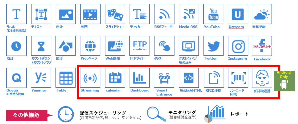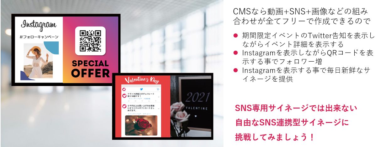 当社のCMS配信システムはドラッグアンドドロップで簡単にコンテンツが作成できるクラウドベースのデジタルサイネージソリューションです。YouTubeや画像・動画、スライドショー、SNSなどの様々な機能を使って、動きを出すことで、より訴求効果の高い広告を作り出すことが可能です。